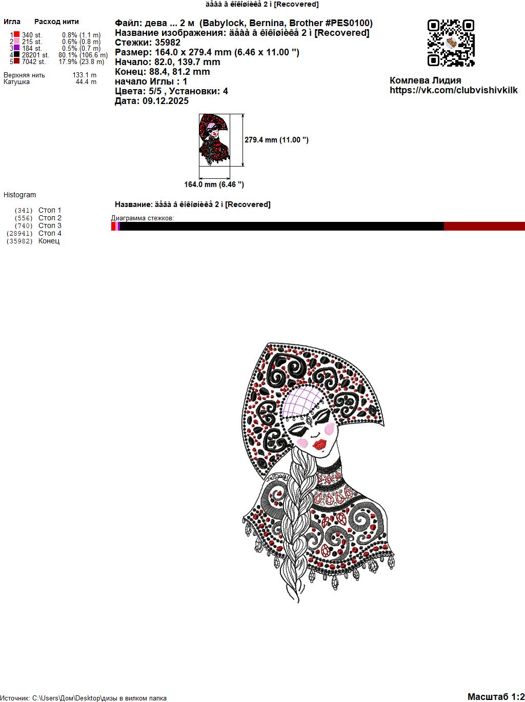 Технические характеристики Файл вышивки Дева в кокошнике