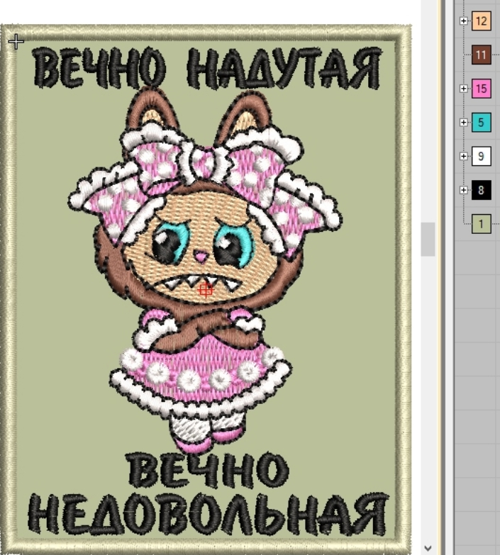 Дизайн для вышивальных машин «Лабубу недовольная» подойдет для различной одежды и аксессуаров.