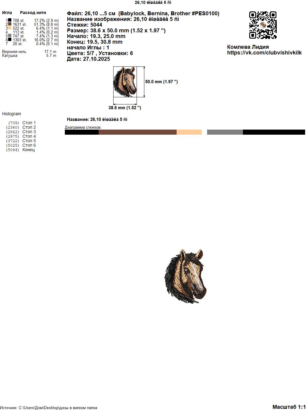 | Размер дизайна, мм50х38 | Количество стежков5044 | Количество цветов5 |