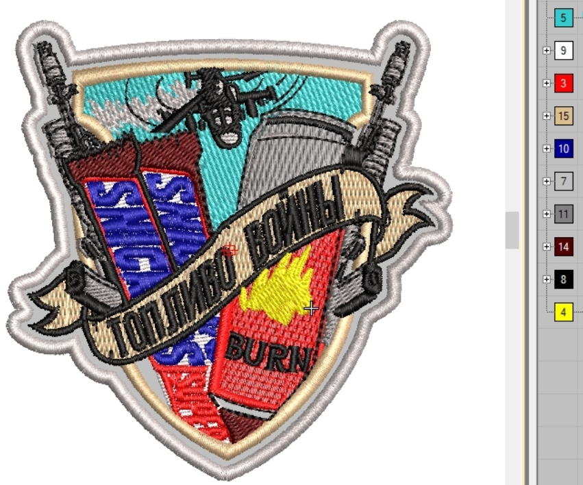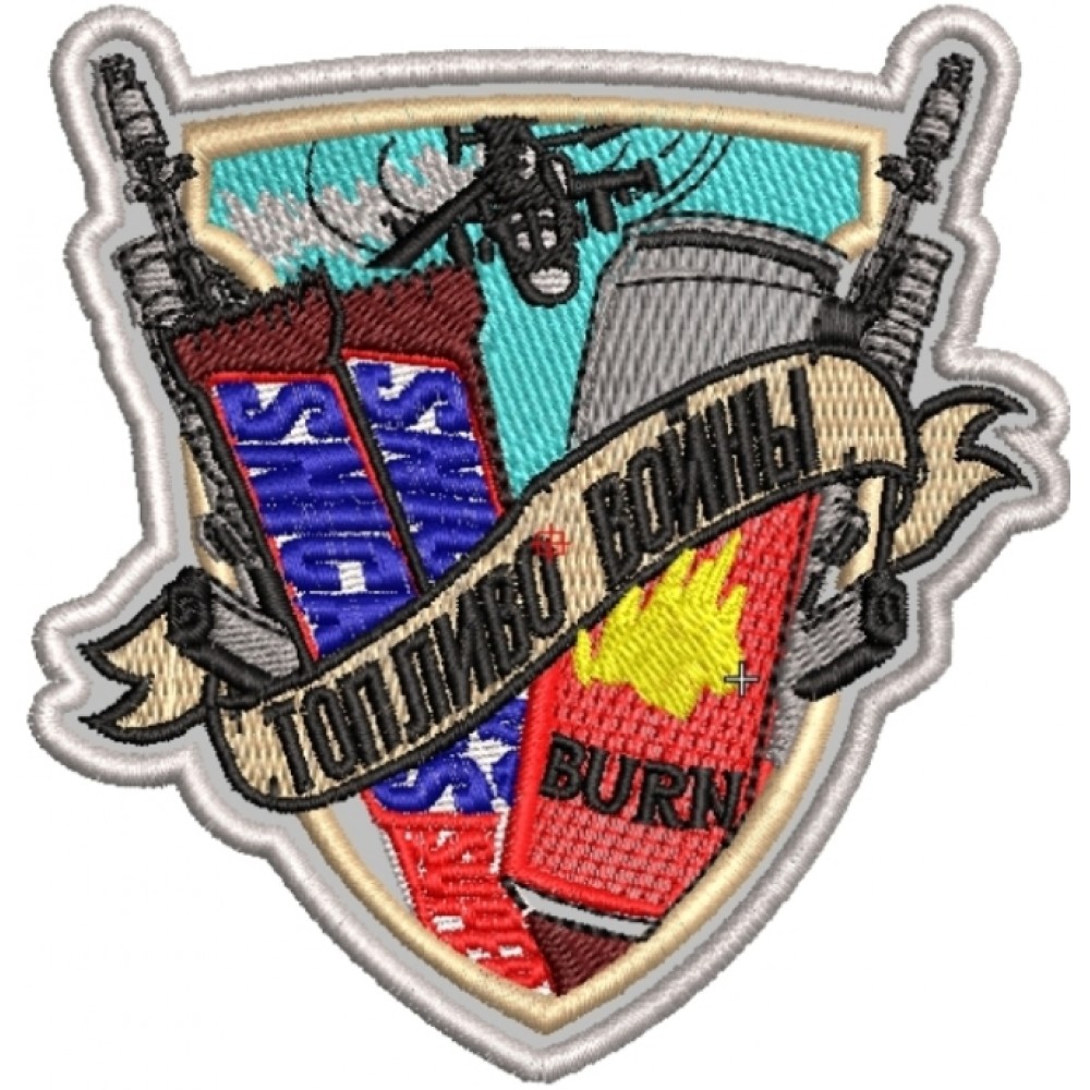 Дизайн для вышивальных машин «Топливо войны» подойдет для различной одежды и аксессуаров.